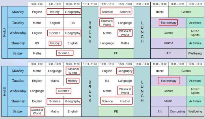 在英国著名的St John's School的官网上,也有这所学校的孩子们的课程表,它分为A周和B周,交替使用课表。