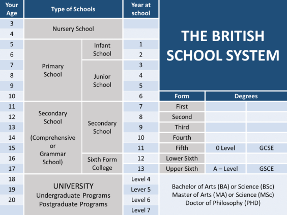 在英国私立教育体系,4岁可以入学Reception(学前班),5岁就上小学一年级(Year1),11岁读完六年级(Year 6)毕业。六年级结束的时候,所有学生会参加“Sats”(Standard Assessment Tasks)。主要考核学生的英语能力(语法、标点符号使用和拼写)和数学。