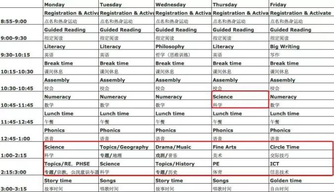 下面这张课程表由一位英国的小学老师分享。英国小学一共开设英语、数学、科学三门主科(国家考试科目)和美术、设计、音乐、体育、历史、地理、IT等辅课。