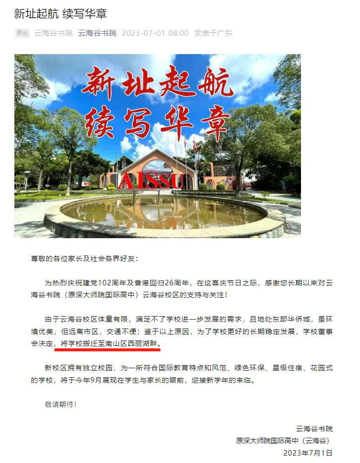 首要原因是,原校园设施已无法满足学院日益增长的发展需求。为了进一步扩大招生规模并实现更为独立的办学模式,搬迁成为了必然选择。这一决策与两个重要事件紧密相连:一是深大宣布终止与深大师院国际高中的合作项目,二是深大师院南山校区迁至展华,这两大变化无疑对云海谷书院的发展路径产生了深远影响。