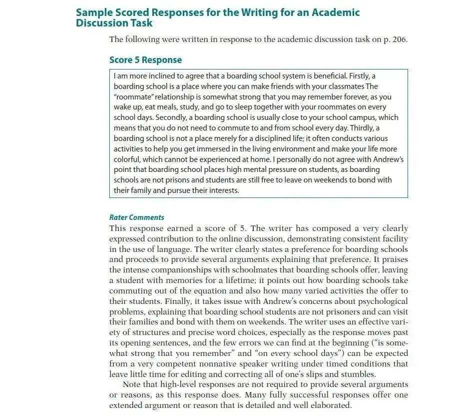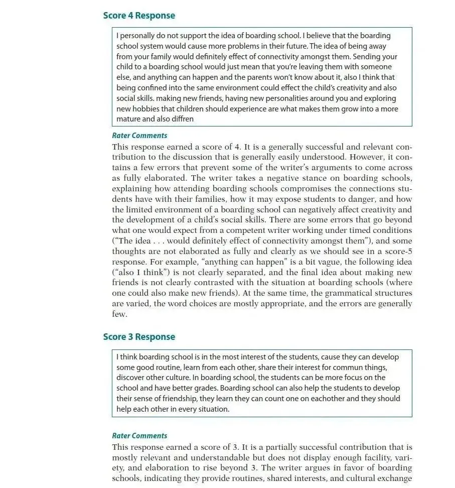 从给出的范文示例中,我们可以观察到,在5分的范文中有所涉及,但在4分的范文中却未被提及,它仅仅针对老师所提的问题表达了个人见解。