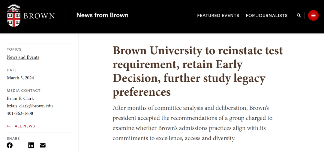 原因主要有两点。首先,布朗大学在官方声明中提及,SAT和ACT的成绩被视为一个关键指标,能够有效预测学生在布朗大学严谨学术氛围中能否取得成功并提升个人能力。