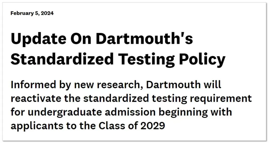 达特茅斯学院宣布从明年开始,所有申请者必须提交SAT/ACT成绩。