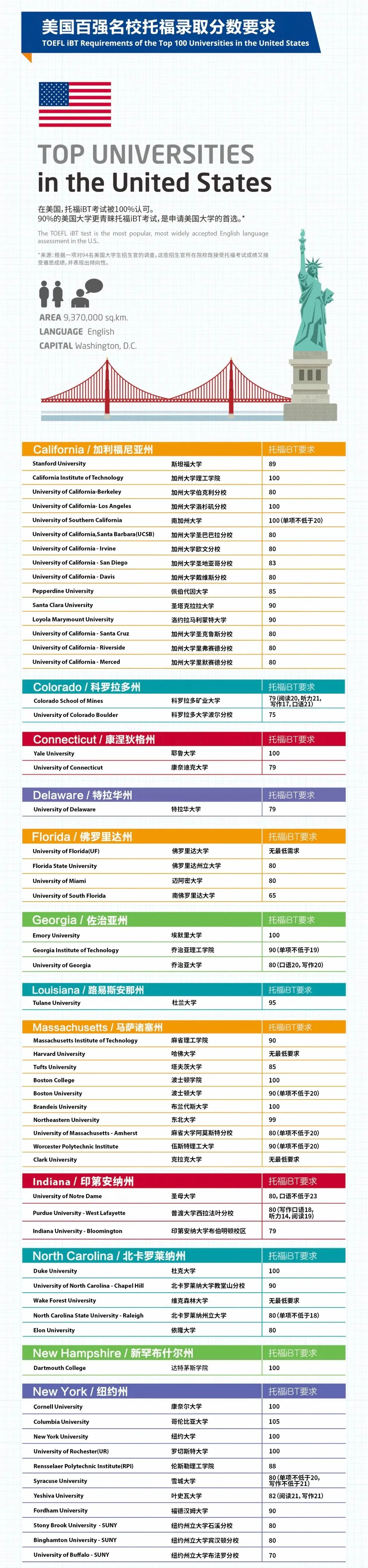 不过,别担心,并非所有位列TOP50的美国顶尖高校都要求极高的托福分数,有些学校仅需80分以上便达到标准!详情如何,一张图表即可一目了然,快来查阅下方的图表,一切便知!