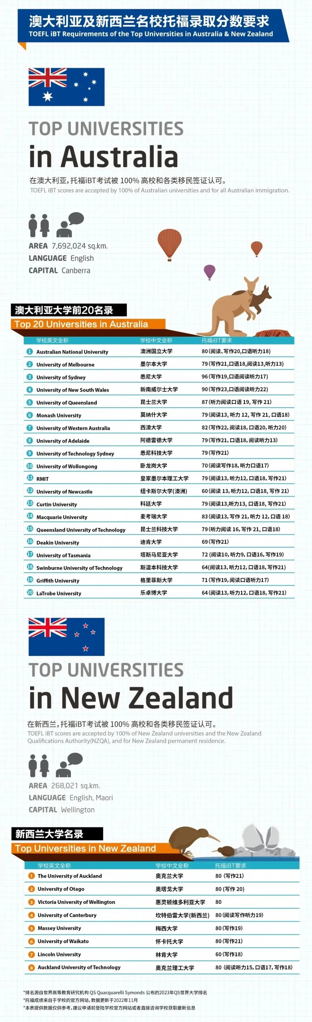 根据2024年QS世界大学排名,澳洲有3所大学跻身世界前二十,更有8所大学位列前一百,这样的成就确实令人瞩目!接下来,我们将为大家提供澳洲和新加坡各大院校对托福成绩的具体要求,以供各位参考。