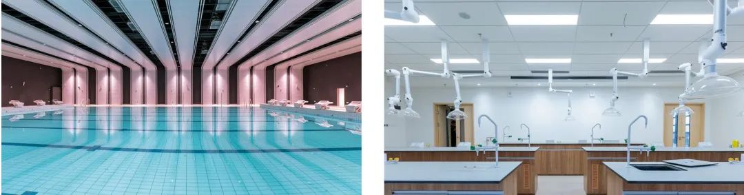 校园内配备了可容纳800人的大型中心剧场、校园图书馆、阶梯教室兼演讲厅、交响乐训练室、恒温标准泳池、多功能体育馆、标准的200米跑道足球场、全天候操场、中庭戏剧广场以及校内直饮水系统等一系列设施。此外,新校区还设有三层学生餐厅,以及两栋专门服务于初中和高中阶段学生的宿舍楼。