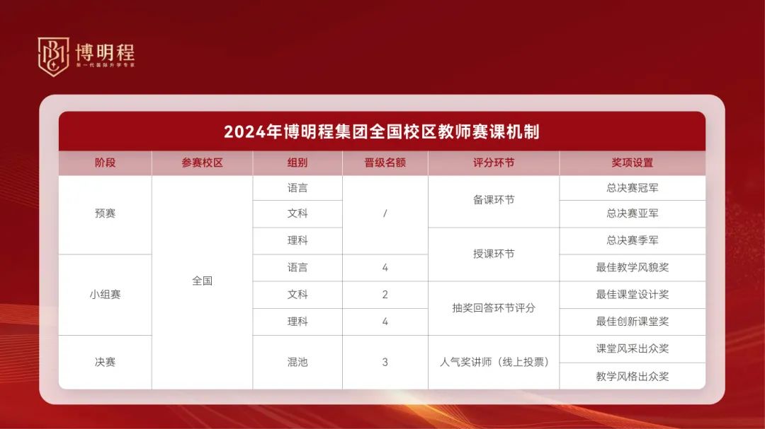 一年一度的博明程教学教研中心师资力量技能评比大赛已于2024年6月3日正式开始。全国各校区的教师全员参与,分为语言、文科、理科组,历经一个半月通过三轮赛课角逐,最终将于7月13-14日在博明程集团总部进行最终决赛,最终结果也将于7月15日公布,敬请期待!