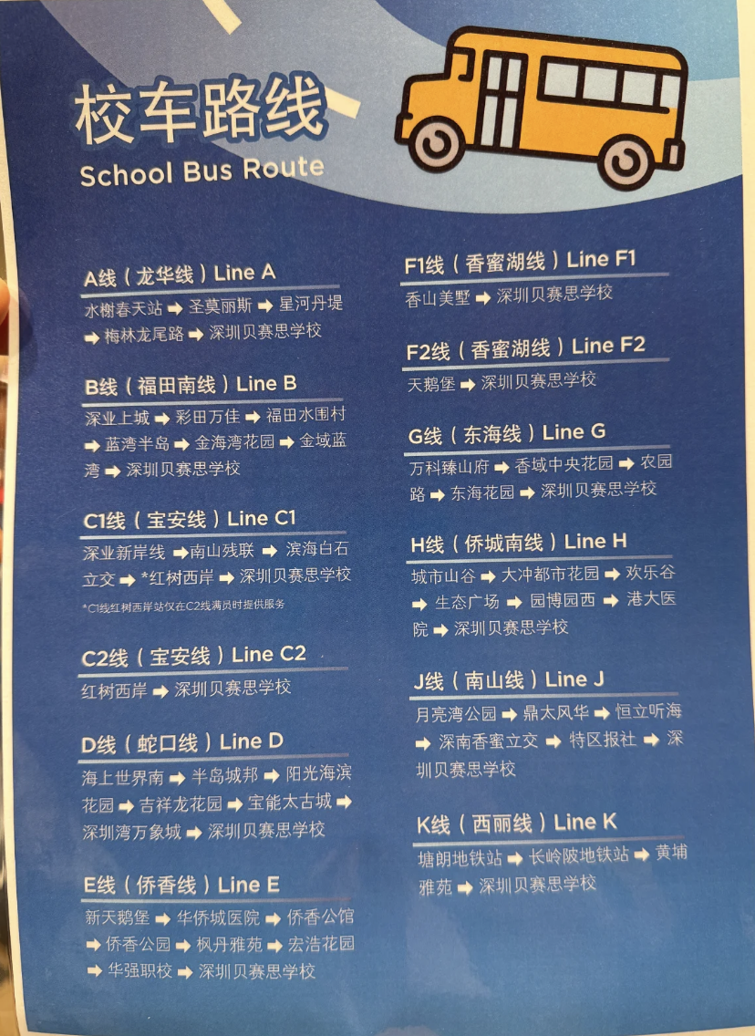 深圳贝赛思福田双语学校为广大学子提供了便捷的校车服务。目前,福田贝赛思的校车路线共有12条,这些路线覆盖了南山、福田、宝安、龙华四个主要区域,满足了不同家庭的需求。