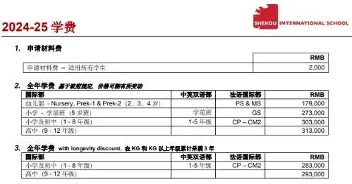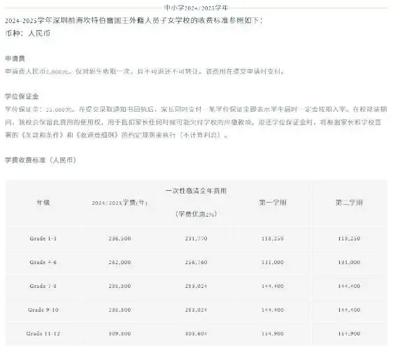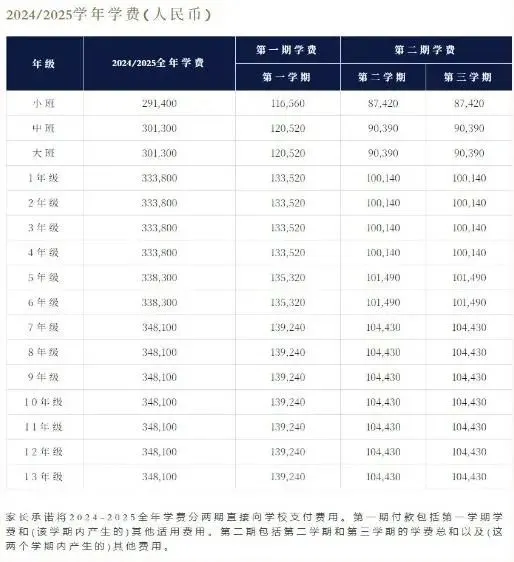 在学费方面,蛇口国际学校在IB纯外籍学校中一直是最昂贵的之一。2024年秋季,学费再次上涨,小学和中学每个年级的学费增加了3.5万,因此小学1年级的学费起步价就超过了30万。此外,新生还需要缴纳一笔资本税,如果选择一次性付款,则为6万,若选择分期付款,则总额接近7万。