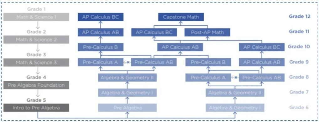 G8(八年级):在G8年级,学生再次被分为三个层次。最快的班级学习Pre-Calculus AB(预备微积分AB),其次是学习Pre-Calculus A(预备微积分A),最慢的班级学习Pre-Calculus AB。