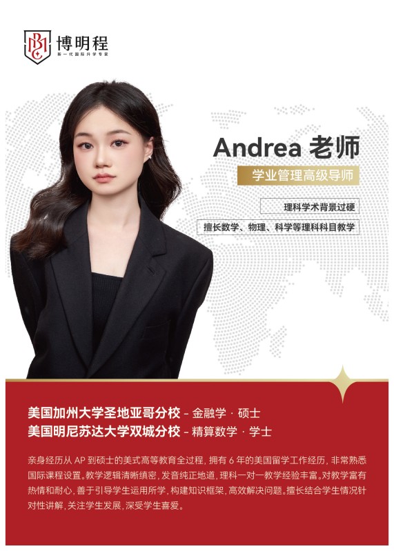 Andrea 老师毕业于美国加州大学圣地亚哥分校,获得了金融学硕士学位。在此之前,她还在美国明尼苏达大学双城分校完成了精算数学的学士学位。这段学术旅程不仅让她积累了深厚的理科知识,更让她亲身体验了从AP到硕士的美式高等教育全过程。这段经历使她对国际课程设置了如指掌,能够精准地把握不同学生的学习需求和难点。