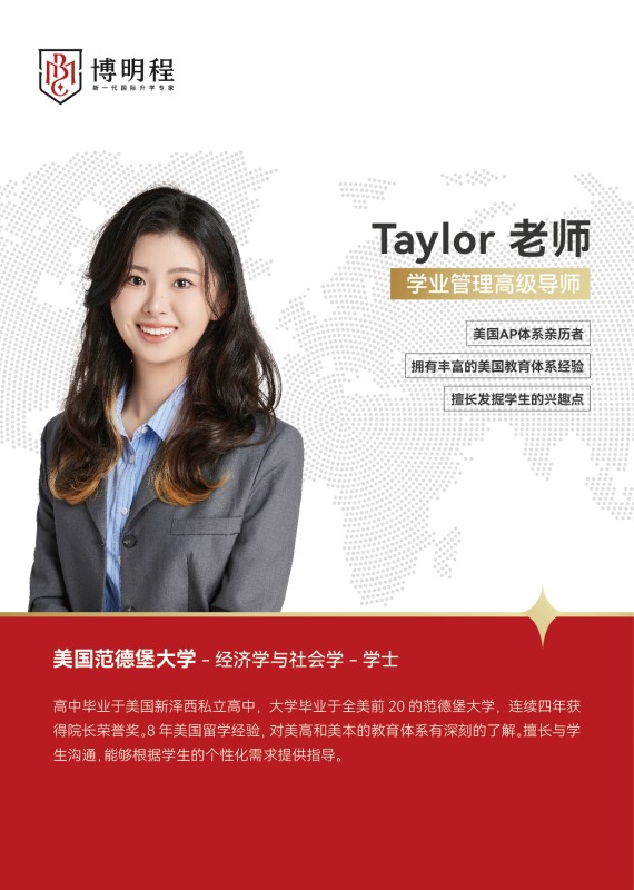 Taylor老师拥有其独特的专业学识,成为了众多学生心中的“国际课程引路人”。作为一位美国AP体系的亲历者,Taylor老师不仅自己在美国新泽西私立高中和范德堡大学接受了优质的教育,更将这份宝贵的经验带给了博明程的每一位学生。