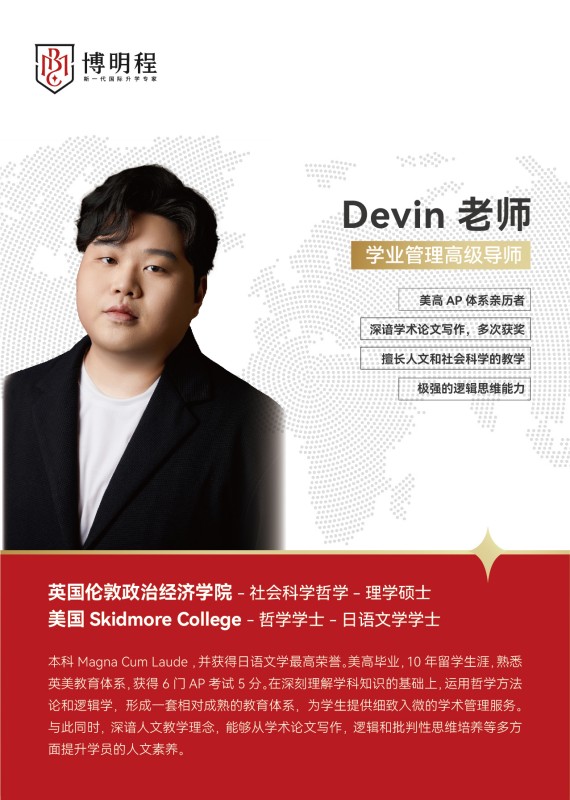在博明程国际教育里,Devin老师以其深厚的学术底蕴和丰富的留学经验,成为了学生们心中的“国际课程智者”。作为一位美高AP体系的亲历者,Devin老师不仅自己在美国接受了优质的教育,更将这份宝贵的经验带给了博明程的每一位学生。