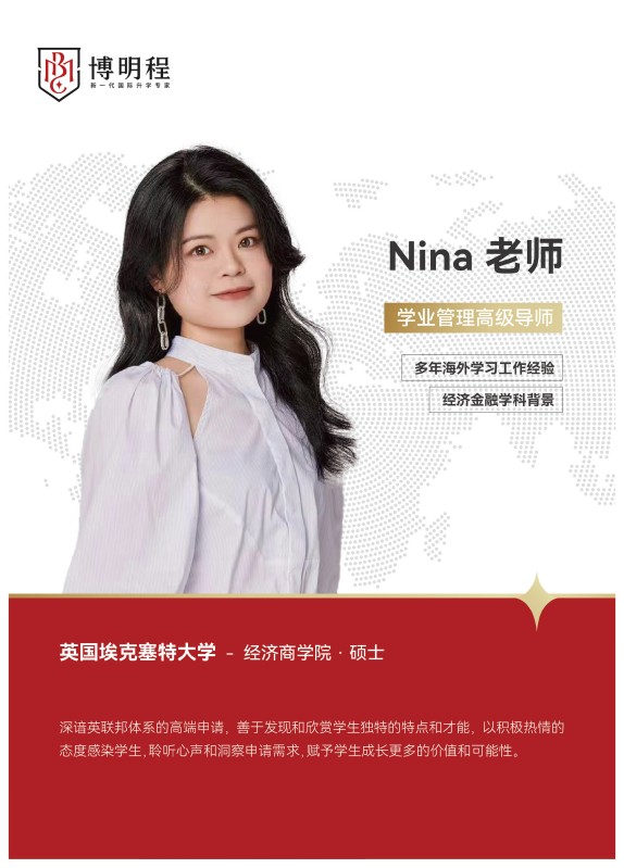 在博明程国际教育这片充满梦想与希望的沃土上,Nina 老师以其深厚的学术背景和丰富的海外学习工作经验,成为了众多学子心中的灯塔。作为博明程国际教育的一名资深学业管理高级导师,Nina 老师不仅拥有英国埃克塞特大学经济商学院的硕士学位,更在多年的教学生涯中,积累了宝贵的国际课程指导经验。