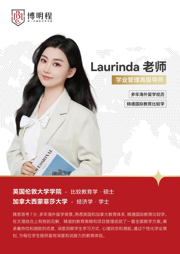 Laurinda老师深知国际课程的复杂性与多样性,她凭借自己多年海外留学的亲身体验,对英国和加拿大的教育体系有着深入骨髓的理解。她精通国际教育比较学,能够精准地分析不同教育体系的优劣,为每位学生量身定制最适合他们的国际课程学习方案。在Laurinda老师的指导下,学生们不仅能够在学术上取得优异成绩,更能在跨文化交流中锻炼自己的国际视野和沟通能力。