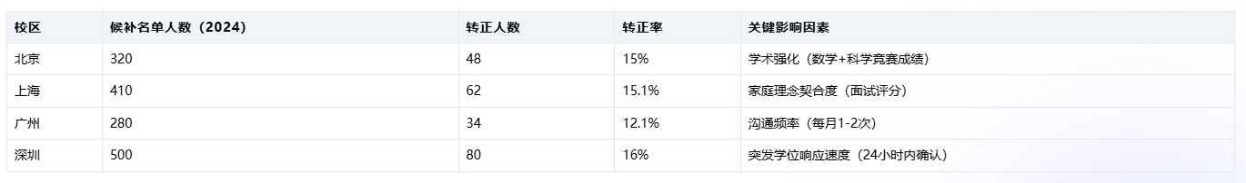 2024年上海校区因外籍家庭离境,在7月临时释放22个学位,其中18个由候补名单中“学术达标且沟通积极”的家庭获得(来源:贝赛思华东区招生办)。