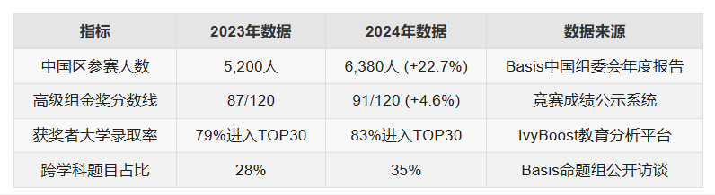 贝赛思数学竞赛(Basis Math Competition)作为全球最具影响力的中学生数学赛事之一,其获奖经历已成为顶尖大学录取的关键参考。根据2024年《贝赛思竞赛官方白皮书》显示,过去两年参赛人数增长率达23%,中国区获奖者中83%被TOP30大学录取(来源:Basis Global Education,2024)。本文结合近两年官方数据,系统梳理竞赛生核心加分项。