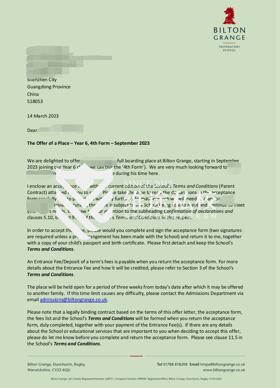录取学校:比尔顿农庄预备学校(Bilton Grange)九大公学对口小学