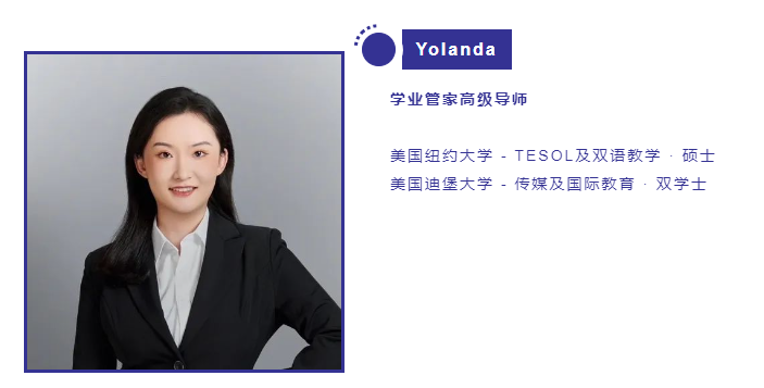 小学六年级移民加拿大,拥有超 15 年海外留学及生活经历,11&12 年级曾就读于 HIS 杭州国际学校,本科毕业于纽约大学心理学、社会学双专业,以最高拉丁荣誉毕业,硕士毕业于哥伦比亚大学英语教育专业。毕业后在国际教育行业工作多年,对国际教育体系有非常深入的理解和见解。持有纽约州公立学校教师资格证,美国 PSICHI国家荣誉心理学会成员,曾担任美国中小学校 ELA/ESL 混合班联合教师,有丰富的美国中小学一线教学经验。了解国际体系中学生的痛点和需求,擅长结合学生的特点提高英语听说读写的综合能力。