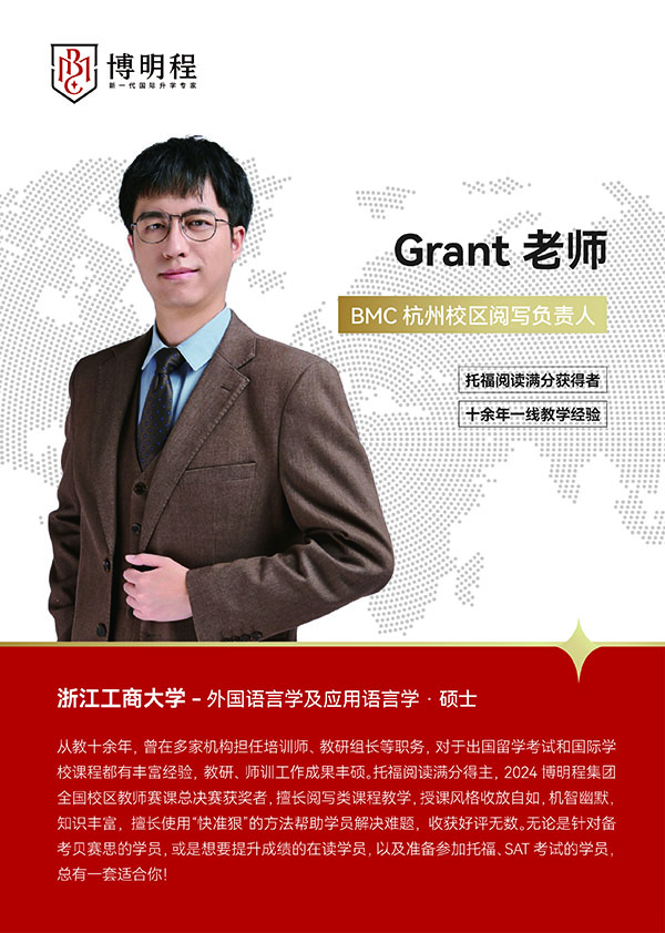 作为托福阅读满分得主,Grant老师对考试规律与命题逻辑有着透彻理解。他毕业于浙江工商大学外国语言学及应用语言学专业,硕士学历背景赋予其深厚的语言功底与学术素养。从教十余年间,他曾在多家知名机构担任培训师与教研组长,主导研发多套阅写提分课程,教研成果覆盖托福、SAT、国际学校课程等多元体系。2024年,他凭借创新课程设计斩获博明程集团全国校区教师赛课总决赛大奖,进一步印证了其教学实力。