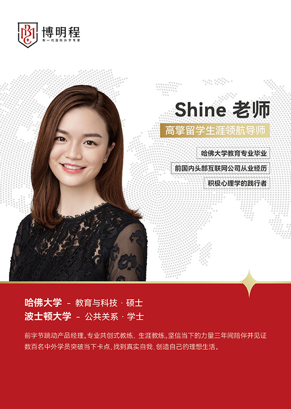 Shine老师目前是博明程集团高擎留学的导师,是一位集智慧与才华于一身的教育者,她的学术背景堪称精英教育的典范。她不仅拥有波士顿大学公共关系学士学位,更在哈佛大学深造,荣获教育与科技硕士学位。不仅让她在知识领域拥有广阔的视野,更为她日后的教育事业奠定了坚实的基础。在哈佛的求学时光里,Shine老师不仅汲取了前沿的教育理念,更深刻体会到了教育的力量——它能够激发人的潜能,改变人的命运。