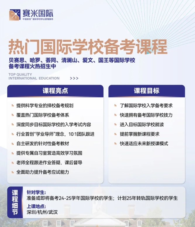 热门国际学校备考课程火热招生中!覆盖贝赛思、深外国际部、哈罗、荟同、清澜山、国王等国际学校,8大课程亮点,可咨询博明程集团官网微信和电话联系,或者保存二维码加微信咨询。