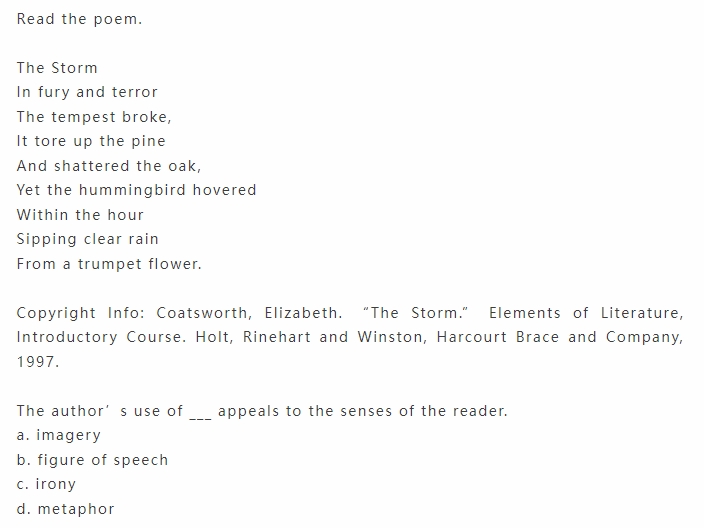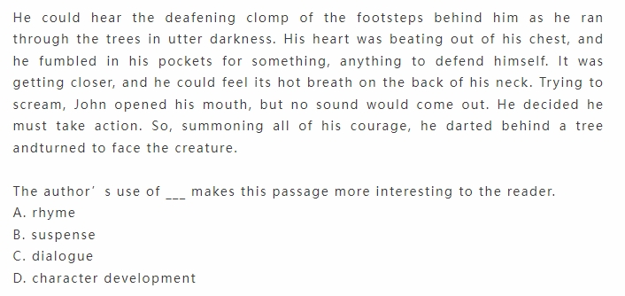 要解决这个问题,学生应该知道rhyme。、suspense、dialogue和character development分别代表什么写作技巧,它在文章中的应用方法,以及一些有代表性的例子,了解清楚这些,就可以自由地处理这类问题,而这种考试方法在国内考试中并不常见,或者说考虑起来并不像MAP那样困难。