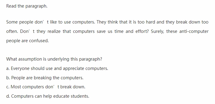 虽然这个问题是在问这句话中假设的,但熟悉MAP测试方法的学生会知道,事实上,这个问题是在问作者的立场,所以他们会立即找到一个句子来表达自己的立场和观点——“Don’t they realize that computers save us time and effort?“(难道他们没有意识到计算机可以为我们节省时间和人力吗?),我们可以很快看到作者的立场是“计算机可以为我们节省时间和人力”,所以每个人都应该使用和关注计算机,答案是A。