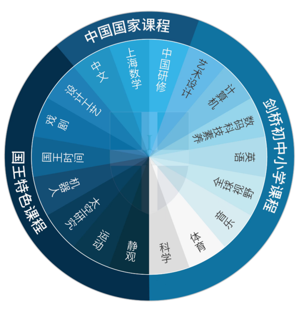 深圳国王学校提供从幼儿园到高中的全学段课程,采用深度融合的中英课程体系。在中小学阶段,学校以成熟的剑桥国际课程为主体,同时融合国王特色校本课程和中国国家课程中的元素,如中文、中国历史和文化、数学等,以及设计工艺、戏剧和舞蹈、太空探究等特色课程,满足学生不同的教育需求。学校注重培养学生的创新思维、国际视野及对中西方文化的深刻见解,致力于培养具有全球竞争力的世界公民。
