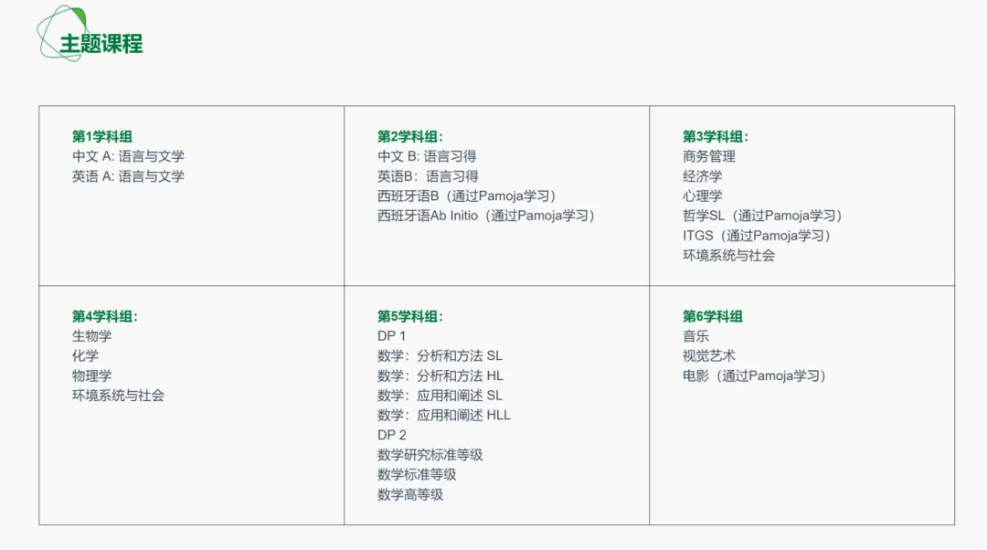 - 高中阶段G11 - G12:学生学习IB DP(大学预科课程),DP课程为期两年,有毕业统考,通常16—18岁学生可就读。学生需完成6个学科的6门课,并完成3个课程核心要素(专题论文;创造、活动与服务;认识论)。