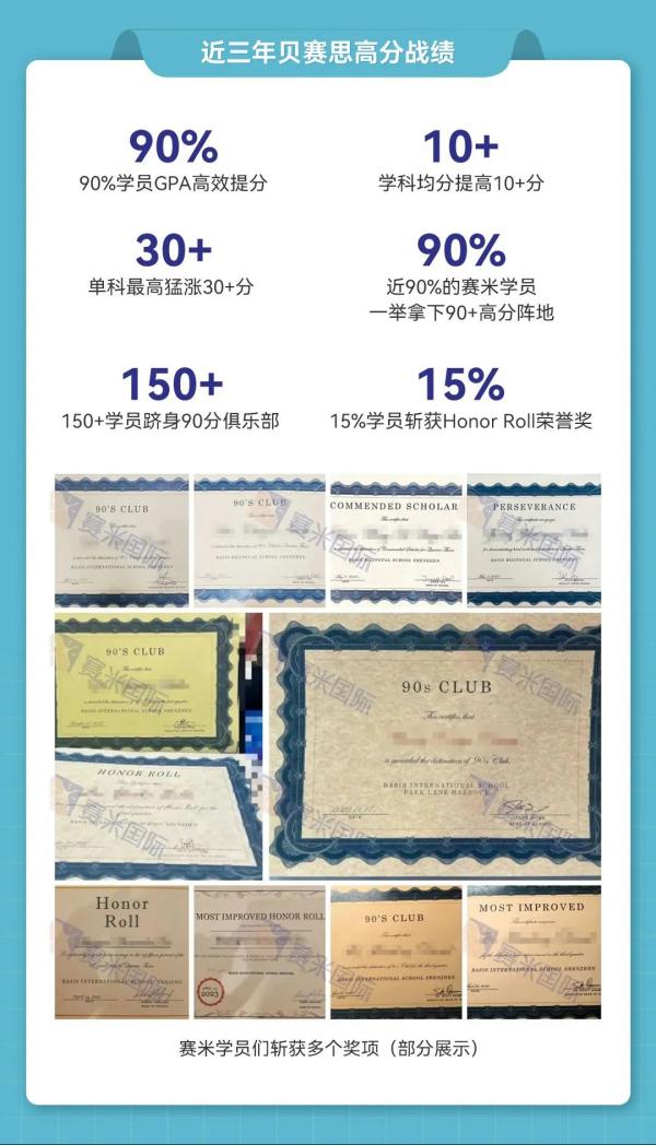 同时,赛米国际已荣获沙利文双认证的一站式学业管理服务,累计服务了3000+组贝赛思家庭,GPA 提分率高达90%,近三年有150+学员迈入了90分俱乐部。
