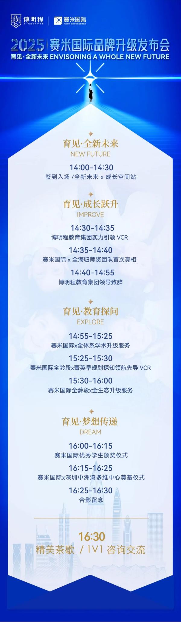 5月24日下午14:00,我们将在「育见·全新未来」2025赛米国际品牌升级发布会上,构建“全体系×全龄段×全生态”一站式国际教育服务的国际教育新模式,为未来教育注入新动能,为行业格局开拓新路径,更为这个亟需全球化人才的时代,提供更富教育力的解决方案。