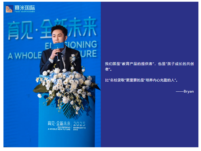 博明程集团合伙人&总经理Bryan阐述了赛米国际对国际教育的深刻洞察,强调教育应尊重个体差异,而非追求标准化,倡导通过个性化评估与跨文化教学发现每个孩子的独特优势。