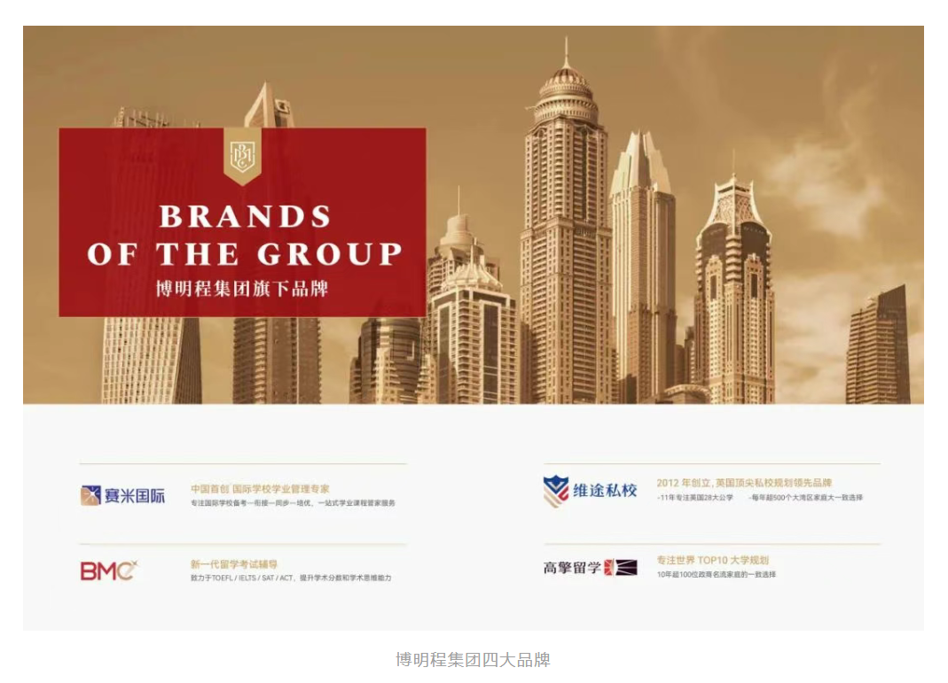 目前,博明程集团旗下已成立「赛米国际」「维途私校」「BMC」「高擎留学」四大品牌,致力于为中国高端家庭提供一站式国际课程辅导、出国考试语言培训、留学规划与申请服务。