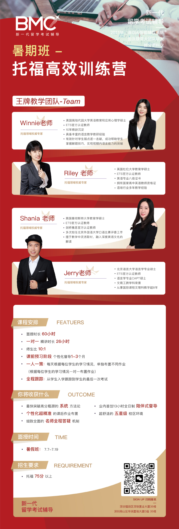 在竞争激烈的留学申请中,托福分数是硬实力的直接体现。博明程BMC暑期托福训练营以“名师团队+科学课程+全周期服务”为核心,为75分+学员打造了一条高效提分路径。无论是短期突破高分瓶颈,还是冲刺顶尖名校语言要求,这里都将是你暑期备考的理想选择。