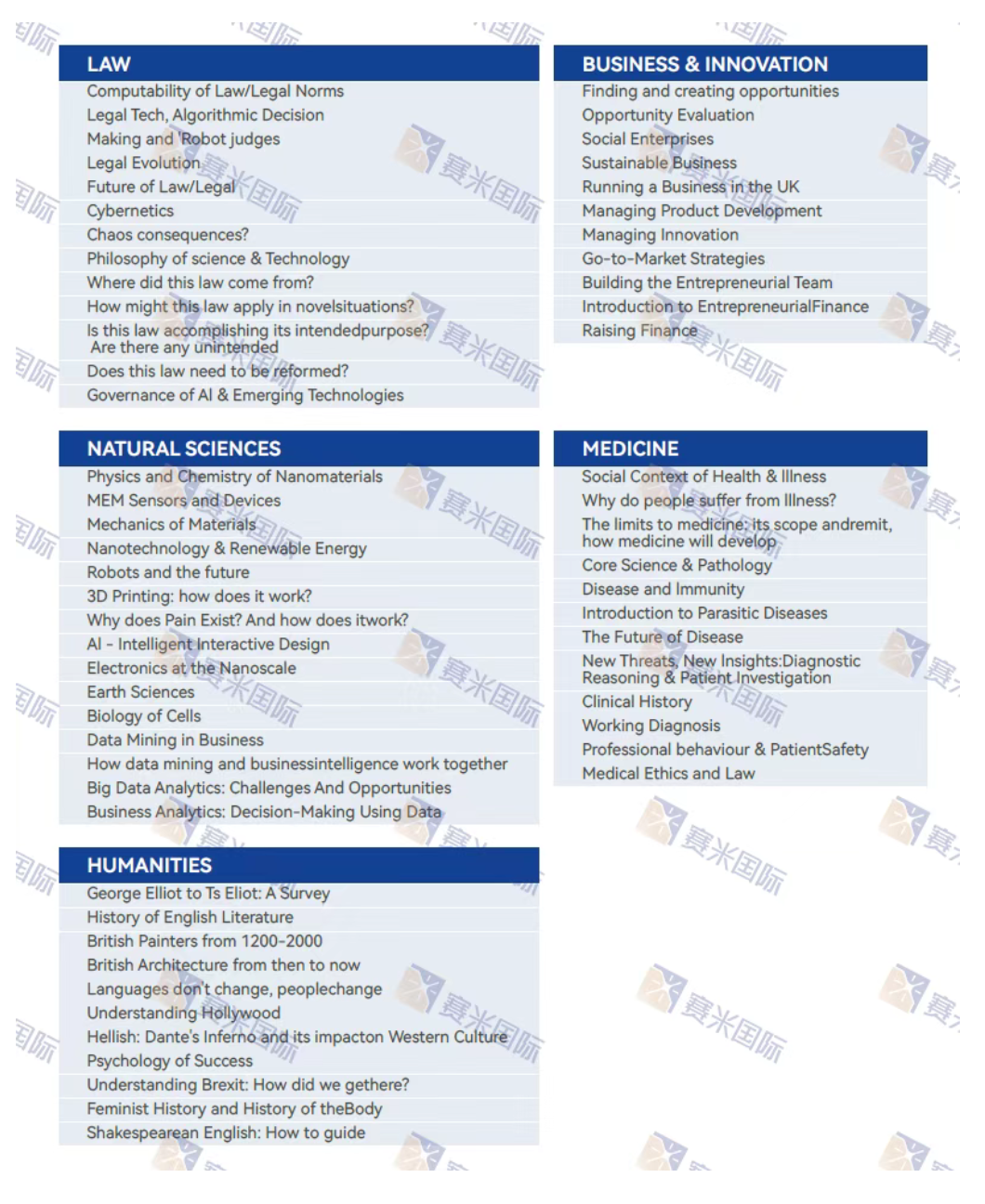 多名牛津大学核心导师,将在暑期为孩子们教授丰富多彩的课程,包括法律、商业创新、自然科学、医学和人文科学,以下是具体的课程安排: