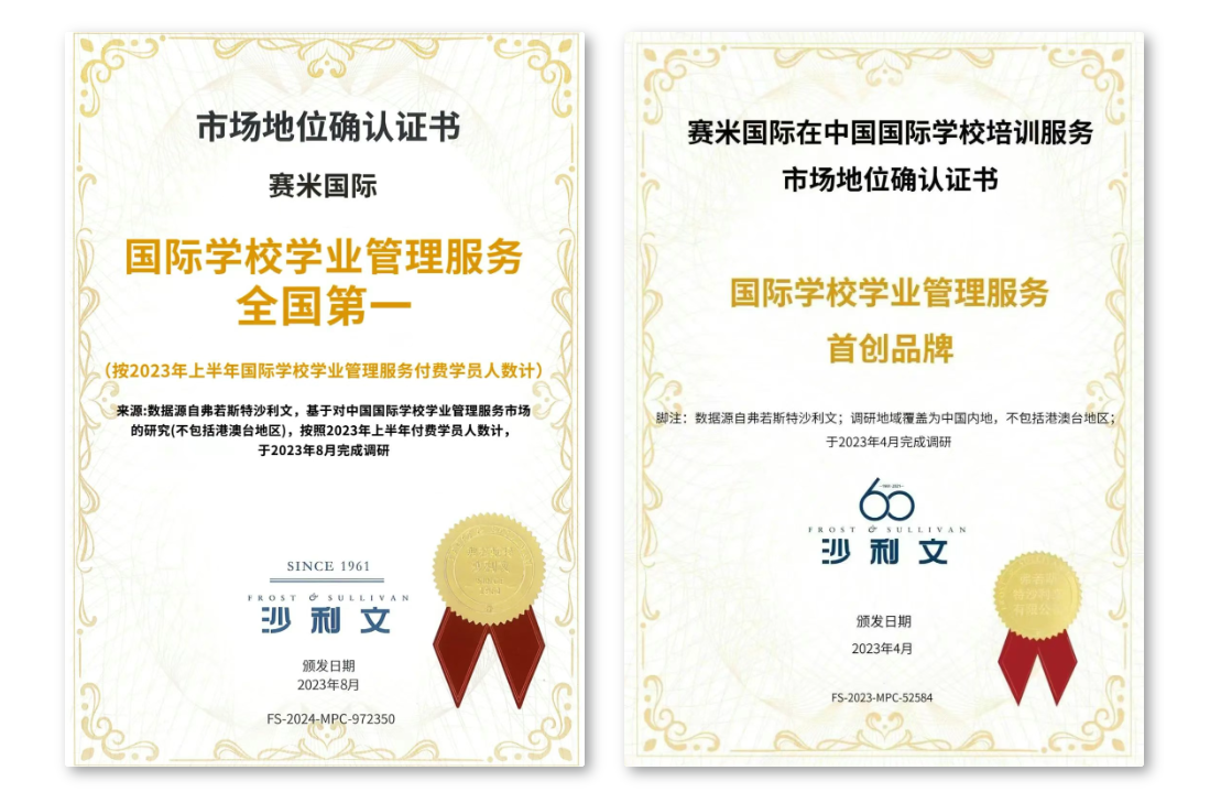 赛米国际作为博明程集团旗下专注服务国际学校学生的核心品牌,拥有100%海归精英+领域顶尖名师,超一流教研和教学团队,深耕国际升学领域十余年,平均授课时长超10000小时。特别是我们的学业管理服务荣获沙利文“全国第一”与“中国首创”两项殊荣,用创新的方法提升孩子的学习兴趣和学习效率,让学习变得既高效。