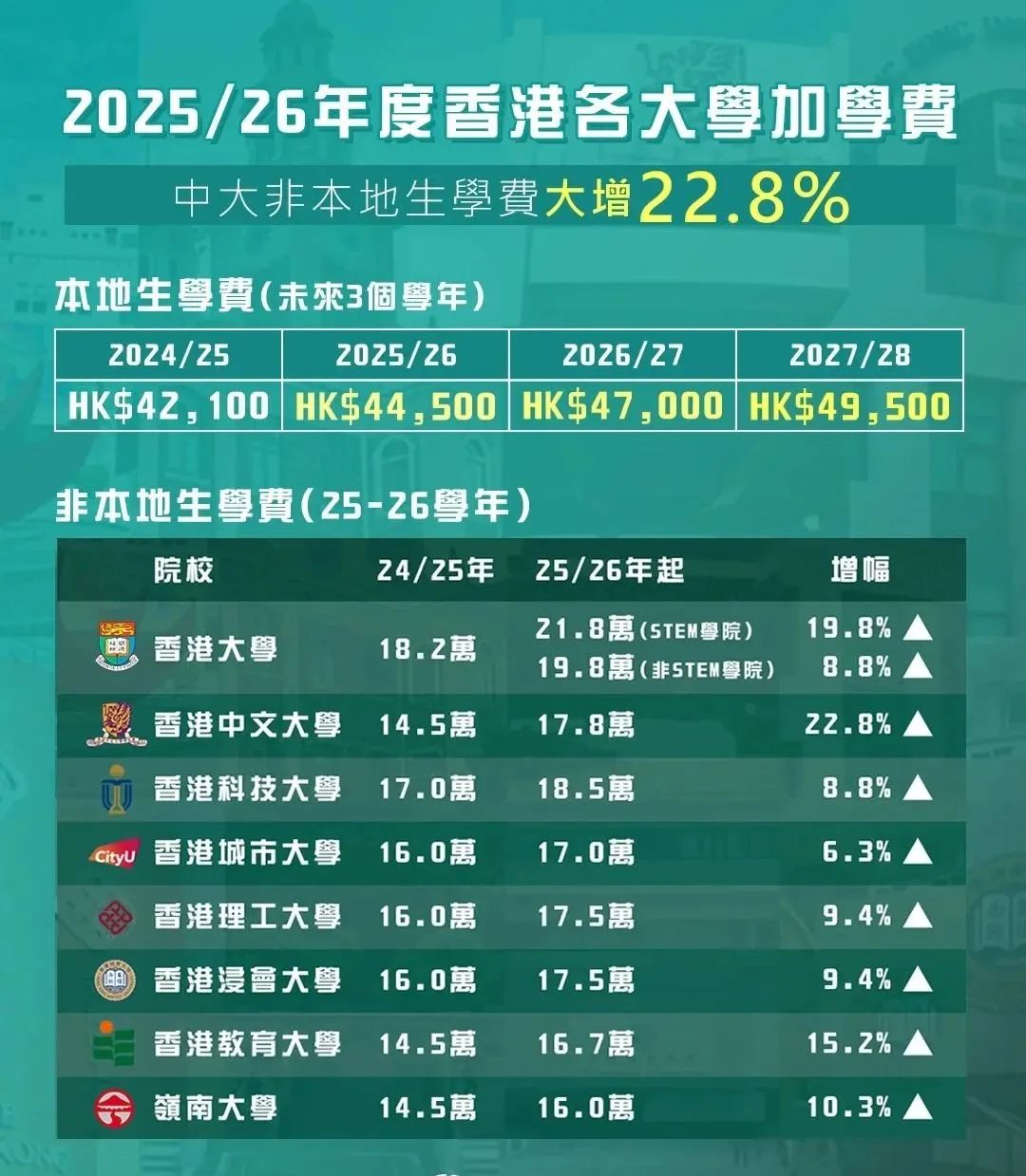 叠加效应下,香港多所高校学费同步上调。本地生学费方面,公立大学本地生学费将于2028/29学年起由现行42100港元调整至49500港元,增幅约17.6%;非本地生学费涨幅更为显著,其中香港中文大学非本地生学费上调22.8%,港八大非本地生学费区间普遍扩展至16万至22万港元。