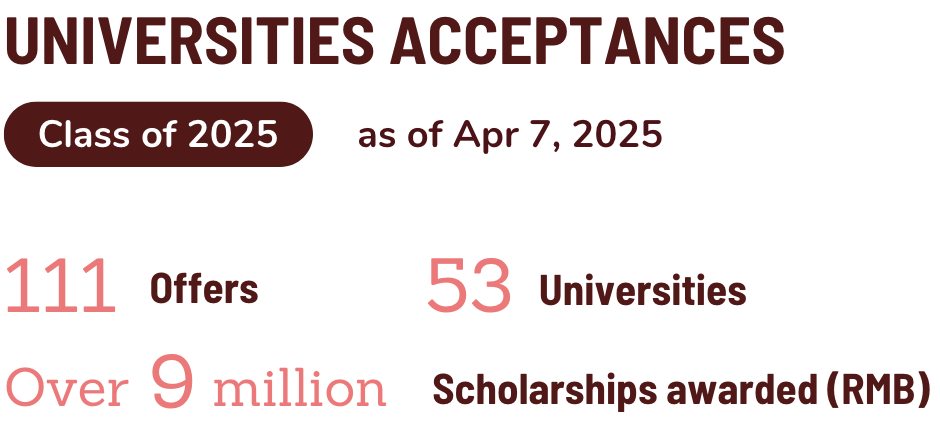 2025届毕业生共收到41份录取通知,录取院校包括剑桥大学、伦敦大学学院、墨尔本大学、多伦多大学等。热门国际学校备考课程火热招生中!覆盖深国交、贝赛思、哈罗、荟同、清澜山、国王等国际学校,8大课程亮点,扫码了解详情!