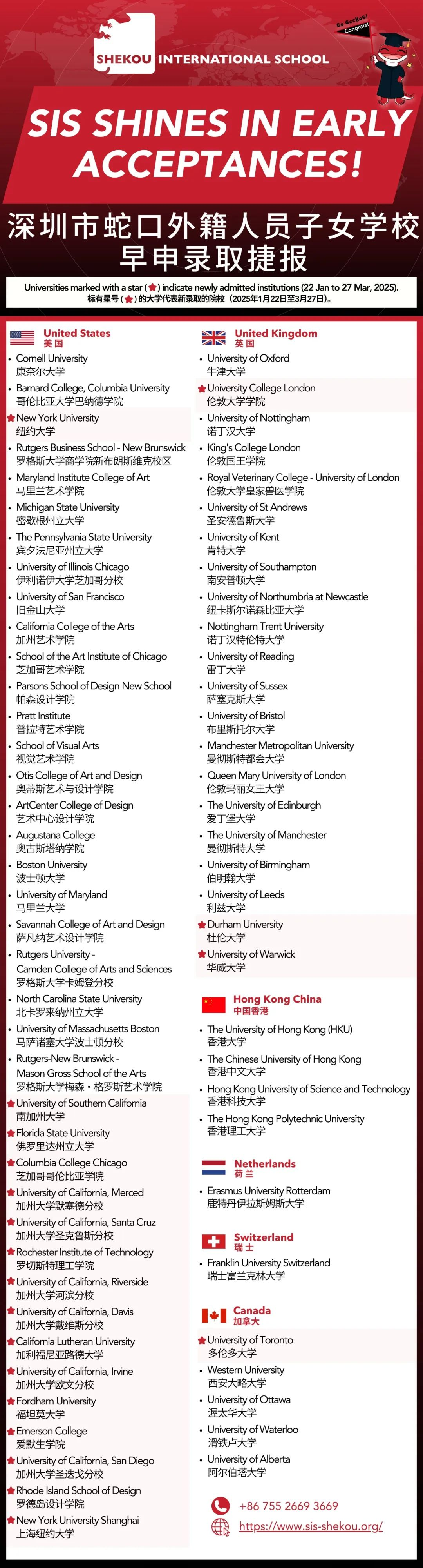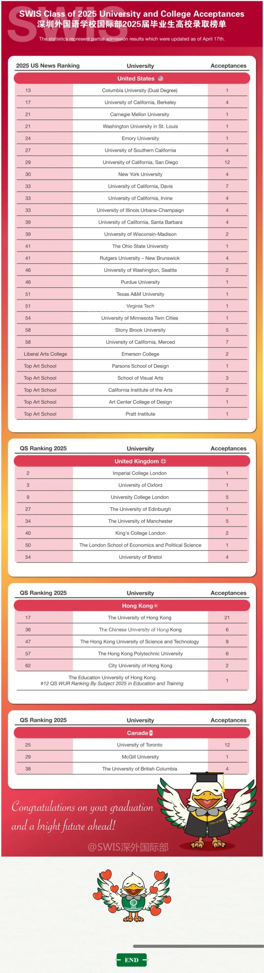 SWIS在2025年申请季中,41名毕业生共收到来自70所大学的206封录取通知书。