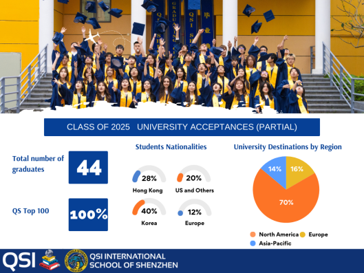 QSI深圳2025届毕业生共44人,所有毕业生均被QS世界前100大学录取,其中QS前50名录取院校包括伦敦大学学院、加州大学伯克利分校、墨尔本大学等。