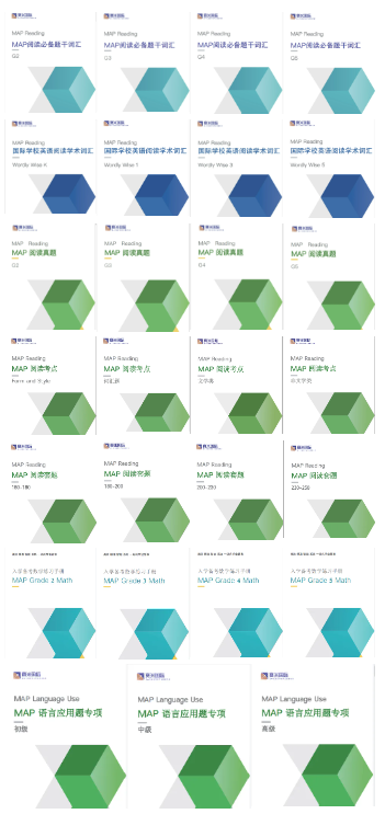 MAP测试系列教材包括:《MAP阅读必备题干词汇》、《国际学校英语阅读学术词汇》、《MAP阅读真题》、《MAP阅读考点》、《MAP阅读日常练习册》、《MAP Reading 阅读套题》、《MAP语言应用题专项》、《MAP入学备考数学练习手册》等等。