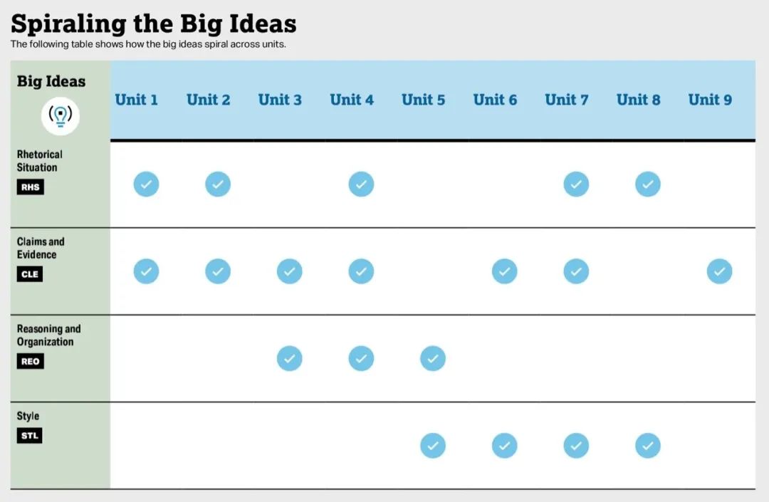该课程包括9个学习单元,循序渐进地培养学生所需的分析和写作技能,将来可用于换取大学学分。对于每个单元,老师可选择一个主题或题目,然后选择各种文本,通常是非小说类的短文章,让学生能够练习和巩固该单元所要求的阅读和写作技能。