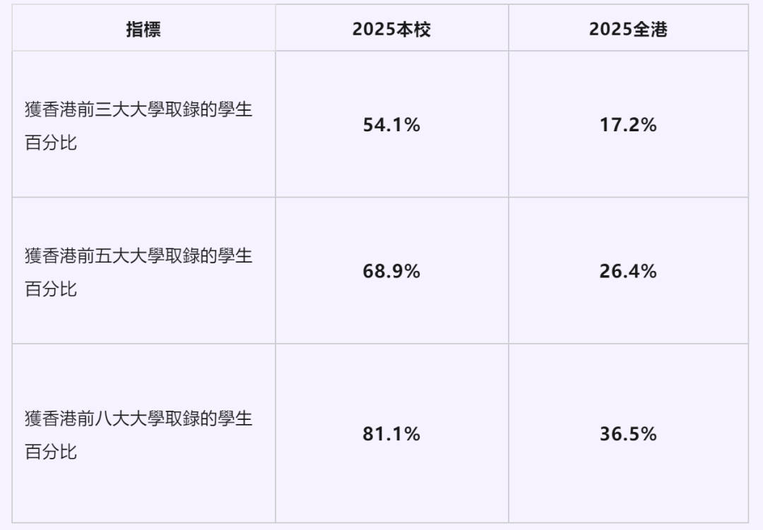 有51名学生被香港前五名大学录取;60名学生被香港前八名大学录取。此外,两名毕业生通过校长的推荐计划被香港大学、香港中文大学和香港浸会大学录取。一名毕业生通过学校推荐的直接录取计划获得香港科技大学的录取通知书,并获得全额奖学金。