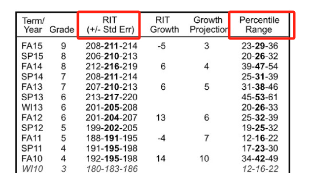 RIT分数(分数绝对值):中间的黑体数字是学生本此考试的RIT分数,两边的数字定义了分数+/-标准误差。即便重新测试,学生的成绩也会落在这个范围内。