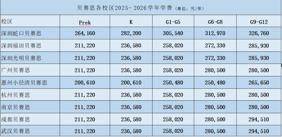 关于北京贝赛思双语学校的学费信息,目前尚未正式公布,但可参考集团其他校区2025-2026学年的收费标准,预计区间在22万至29万元之间(具体以官方最终公布为准)。这一学费水平延续了贝赛思一贯的定位,与深圳、杭州等校区保持一致。