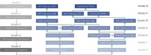 在G5学年结束时将进行第一次分班(全部学生),进入G6学年后开始分层教学,快班学习Algebra 1、慢班学习Pre-Algebra。