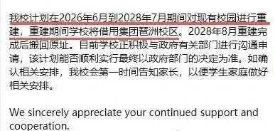最近,不少广州贝赛思的家长都收到了学校发来的邮件通知。邮件中提到,学校计划在2026年6月至2028年7月这段时间,对现有校园进行重建。在重建期间,全体师生将搬迁至新开设的琶洲双语校区,待重建工程完成后,再搬回原校区。