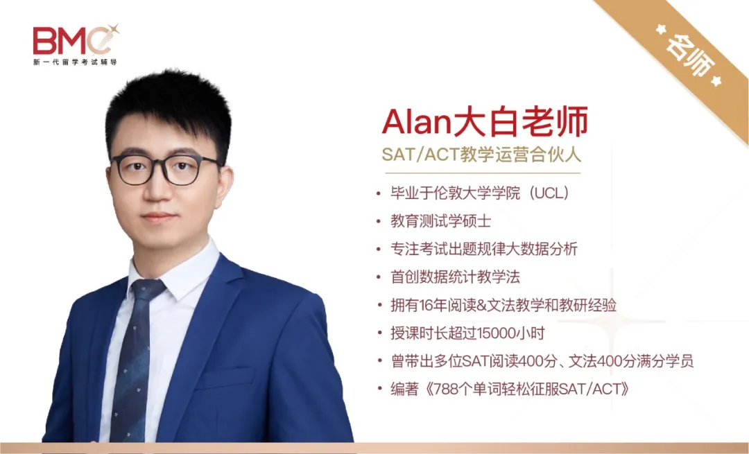 取得优秀的SAT成绩需要长期积累和集中训练,所以大家要提前做好这些考试的规划。BMC SAT阅读文法满分班,火热报名中!8次全真考场级别机考 ,300+高难文章精读课时,300+机考题目讲解课时。助你避开雷区冲刺高分!