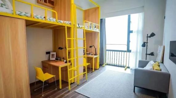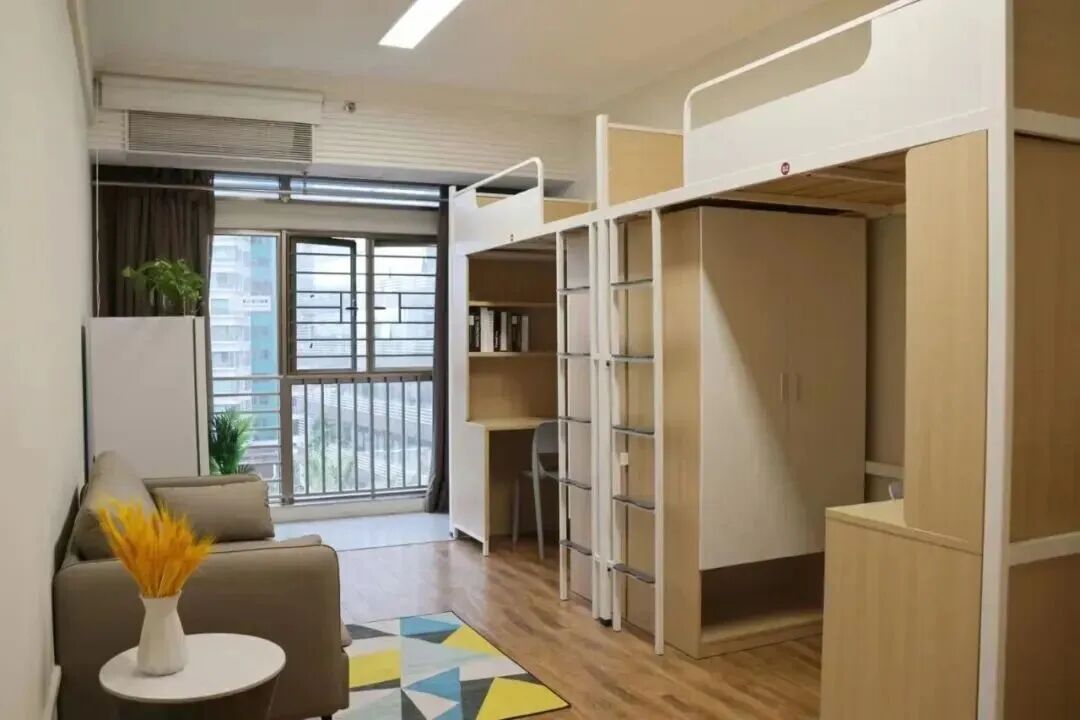 学校宿舍环境堪称一流!宿舍采光极佳,空间宽敞且明亮通透,同时配备了齐全的家具、loft床、书桌、大衣柜等设施,既方便学习又便于储物;角落还设有小沙发和小茶几,是休闲放松的理想之地。更令人惊喜的是,宿舍还设有独立厨房区域,白色橱柜搭配整洁台面,让学生能够自己动手制作简餐,居住体验如同温馨的小家一般。
